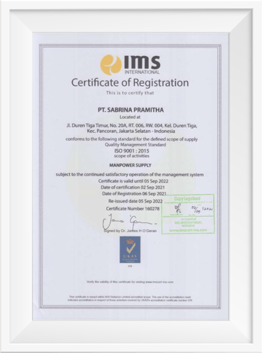 PT. Sabrina Pramitha is a National Private Company officially inaugurated by the Indonesian Ministry of Manpower as a Placement and Labor Supplier Agency for cross-country and cross-continent placements and is also registered as a member of APJATI (Asosiasi Tenaga Kerja Indonesia).
